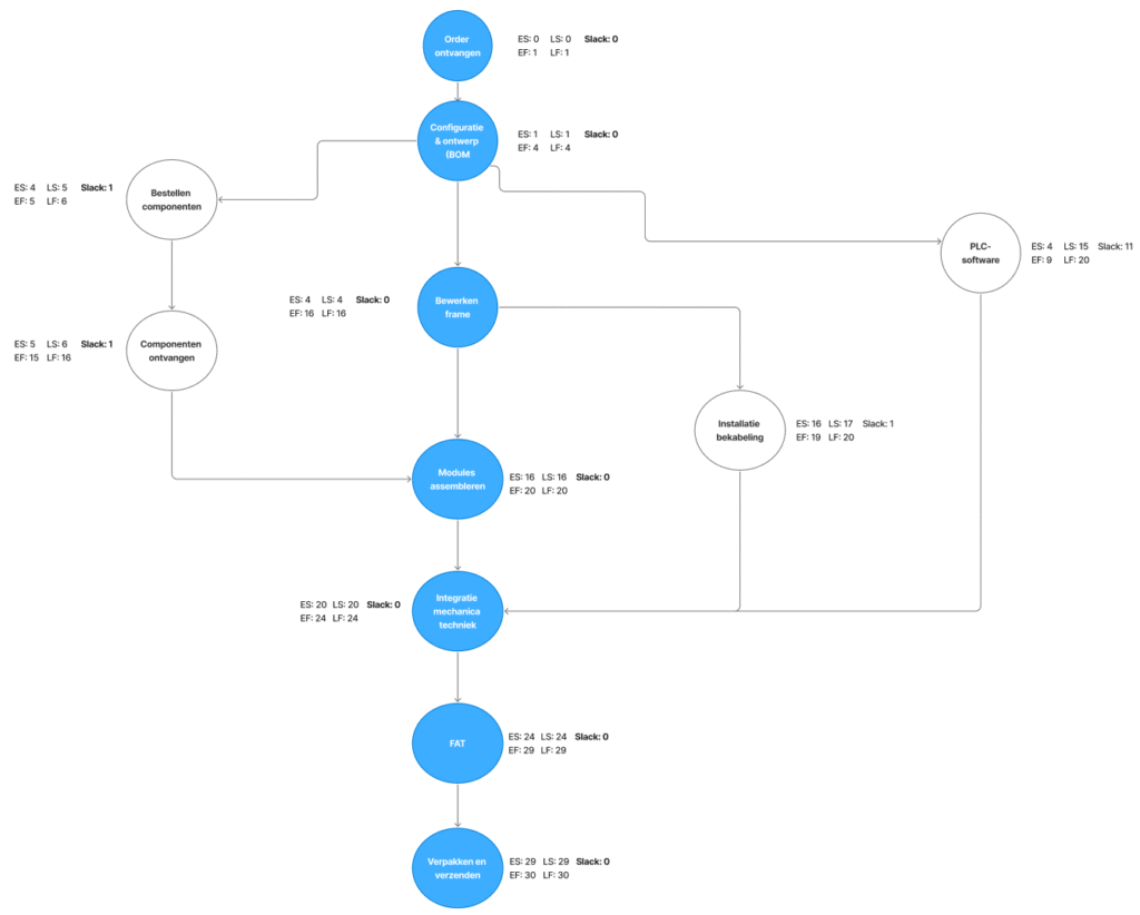 Dit noem je de forward pass, omdat je vooruit plant. Je weet nu dat de doorlooptijd voor deze verpakkingsmachine 30 dagen is.